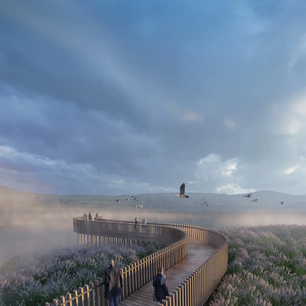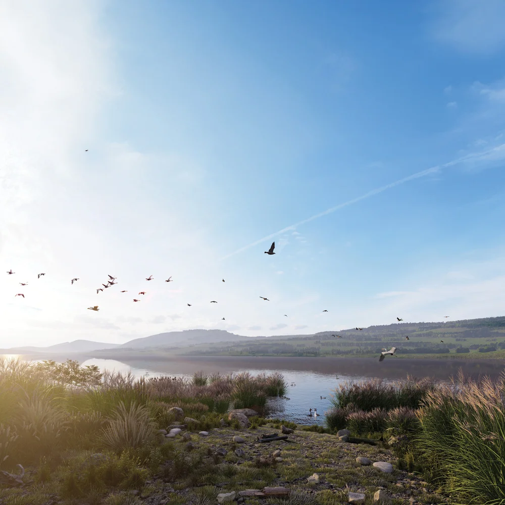 I) Kulturní krajina luk, sadů a lesů na sever, východ a západ od jezera bude obhospodařována ekologicky, volně přístupná veřejnosti a nabídne volnočasové a sportovní aktivity v jezeře i na souši.