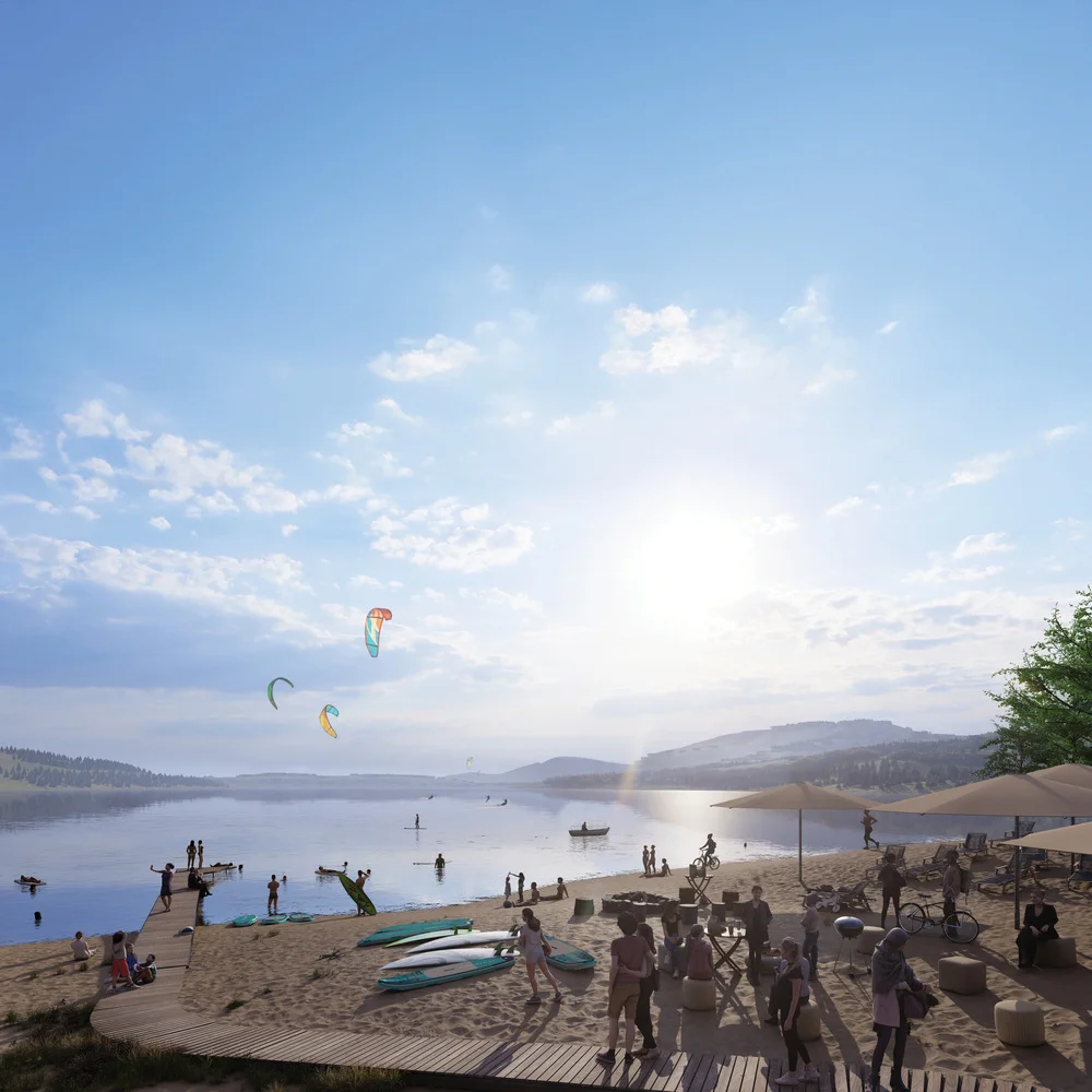 Severní, východní a část západního břehu zahrnují celoročně volně přístupné tematické plochy, které budou sloužit odpočinku, koupání a sportu v extenzivně obhospodařované kulturní krajině luk, lesů a sadů. Pláže se zázemím, gastroprovozy, procházkové, běžecké i cyklistické trasy, kempy, vyhlídky, odpočívadla, grilovací místa a několik zoologických překvapení vytvoří jedinečné prostředí pro aktivní i pasivní odpočinek, lenošení i rodinné výlety.